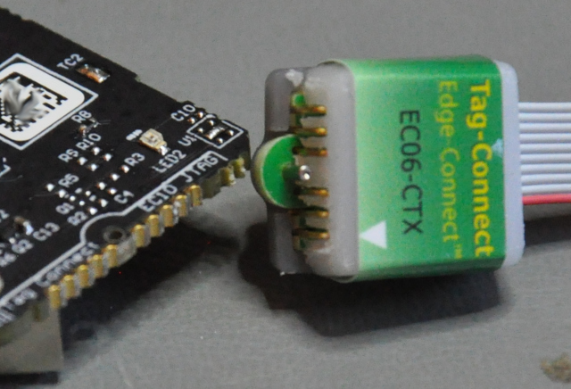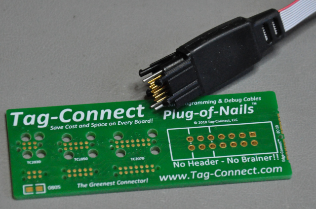 However, many customers I’ve worked with want to use less PCB real estate which means they come up with a custom set of test points. Typically a jig with spring loaded pins are used to contact to the PCB or more often wires are soldered to the PCB. The problem with this solution is that the jig is large, expensive and fragile. Soldering a cable to a board often results in a fragile connection where the cable can easily break a pin and not be immediately obvious. I’ve spent far too much time trying to figure out why I could program the part a minute ago but now I can’t only to realize the cable has a loose wire.