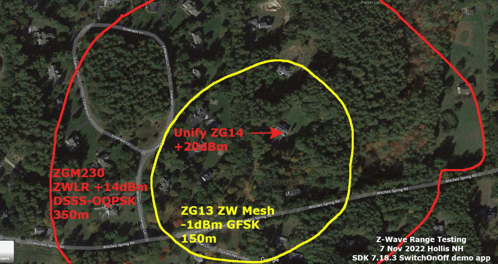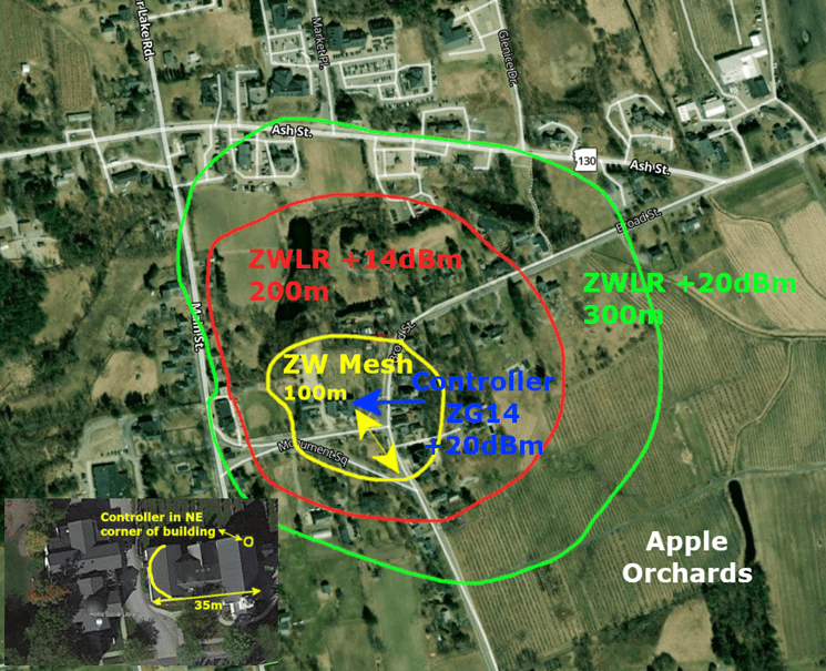 The Yellow circle is the regular Z-Wave mesh range with a controller in a room on the 2nd floor. My home is surrounded by large pine trees which limit the range. Using 700/800 series Z-Wave chips there are no dead spots anywhere in my home. I still have a few 100 series devices, several 300 series and a lot of 500 series devices many of which need the mesh to hop to reach my controller. This demonstrates the increasing range of each generation of Z-Wave. If I were to upgrade all of my devices there would be little if any routing using regular ZW.