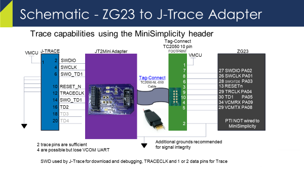 JT2Mini adapter board plugs directly into the Segger J-Trace and MiniSimplicity cable. It only provides two trace data pins which Segger claims will only occasionally cause the CPU to stall. With 4 pins the CPU will almost never stall. Obviously with only 1 data pin you’ve cut the data rate to get the trace info out of the chip and it will stall (insert wait states) anytime the TPIU fifos will up until they are able to unload the data off-chip.