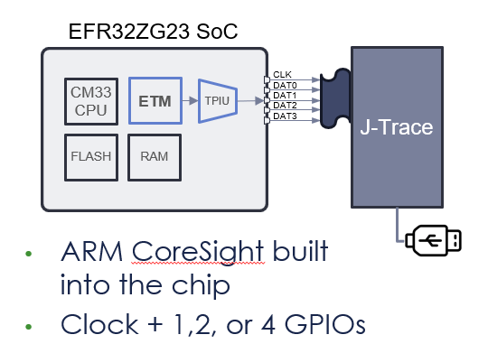 ARM CPUs are intended to be implemented in SoCs so naturally ARM designed in a set of tools to enable visibility and debugging called the CoreSight architecture. For the embedded Cortex processors, and specifically the CM33 in the EFR32ZG23, the key components are the ARM ETMv4 which then feeds the TPIU. The ETM/TPIU tracks the CPU Program Counter (PC), packetizes changes in the PC and thus the program flow, compresses the data, then sends it out the trace pins to an external Trace Port Analyzer such as the Segger J-Trace. The Segger tools decompress and decode the trace data to match it with the image file of the compiled code to show exactly the path the program followed. ARM has a huge amount of documentation on their web site but the problem is there is too much information. ARM has many CPUs, architectures, versions and the entire ETM is an optional component with many configurable parts. This makes reading the ARM documentation much like reading the dictionary, lots of detailed information but it is tough to follow the story of how the pieces work together. Fortunately, Segger has read the documentation and figured out how to make it work.