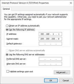 Double click the desired “interface”, then select Properties and scroll down to TCP/IPv4 and click on it and enter the IP address 192.168.1.1 as shown here:
