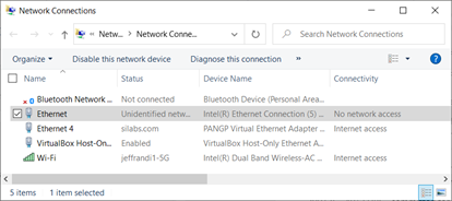 On the Windows10 PC – go to Control Panel\Network and Internet\Network Connections and Select the desired LAN interface. In my case it’s the Ethernet interface on the motherboard. If you connect the WSTK to the interface you’ll see it show up as “no Internet” but connected.